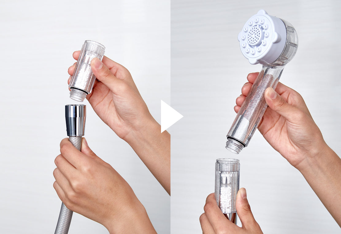 お使いのシャワーホースにミラセルスティックを取り付け、ミラブルリボーン本体を取り付けるだけです(アダプタが必要な場合もございます)。
